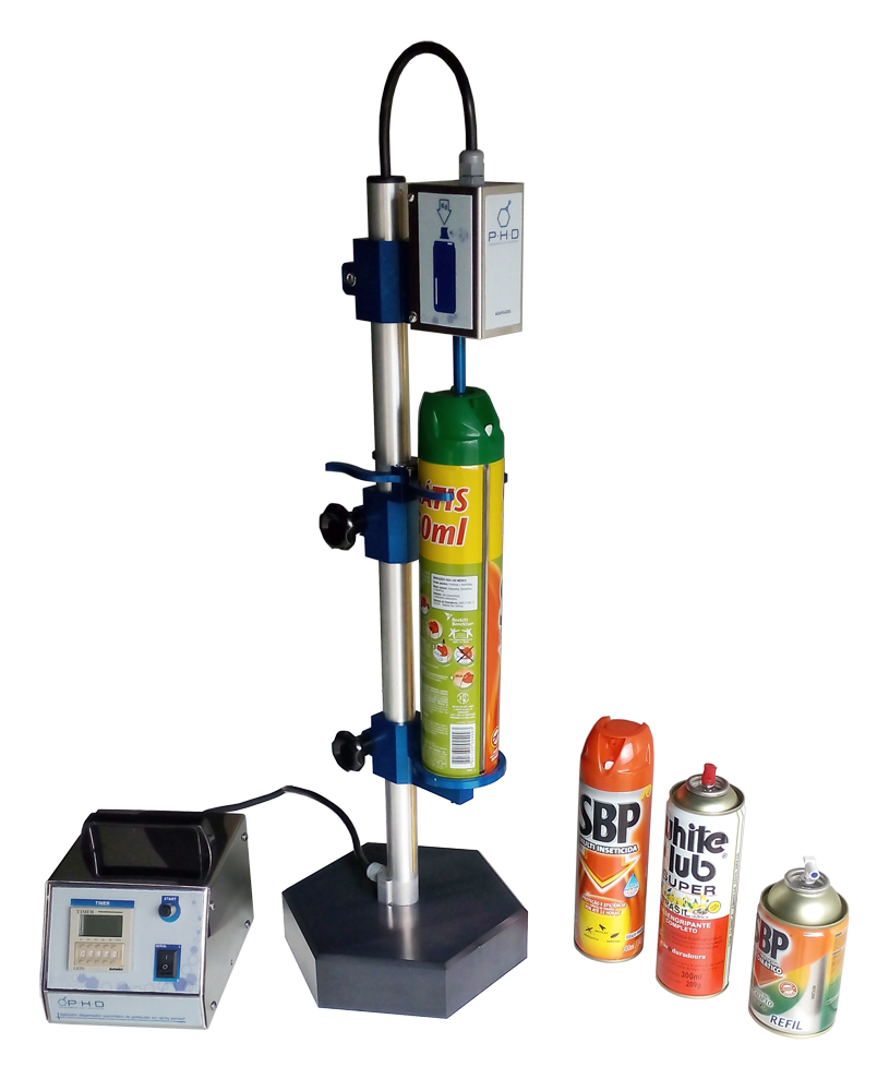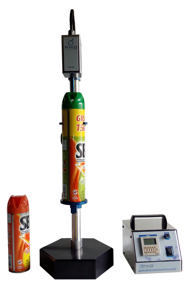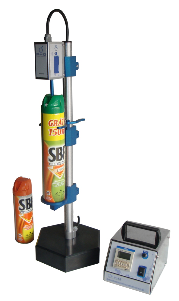 Equipamento desenvolvido para possibilitar em recipientes comercializáveis tipo latas de inseticidas / desodorantes de ambientes, disparos controlados do spray aerossol. Aplicável no estudo teste de eficácia para volatilizantes bem como teste de eficácia em aerossóis frente a insetos voadores.