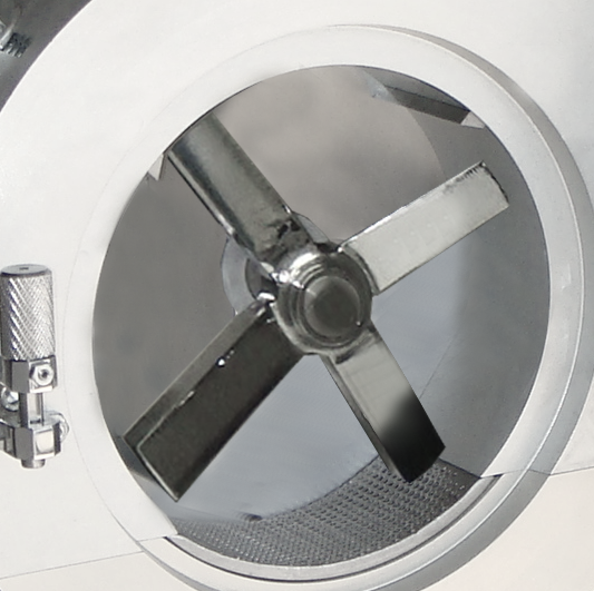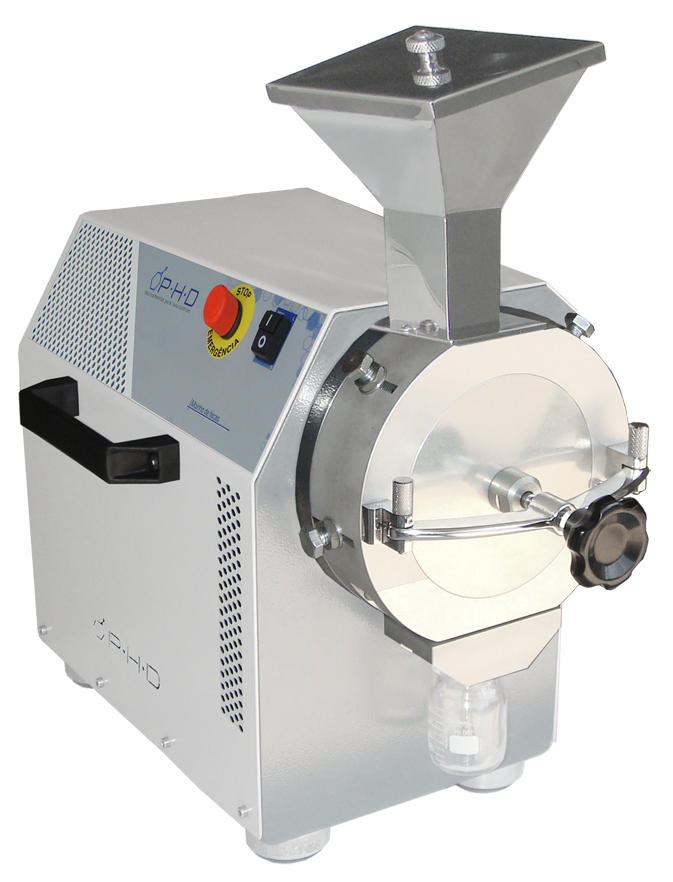 Equipamento desenvolvido para promover moagem em pequenos e médios volumes de produtos diversos como: farelo soja, milho, trigo, pellets, rações, farinhas, desfibramento de celulose, argilas etc... Através de ação rotativa de um rotor com 4 marteletes contra cinta recartilhada localizada na parede interna da câmara, partículas de produtos submetidos à moagem são foçadas a passarem através de peneira crivo circular Mesh 10/20/30. Uso em laboratórios de indústria alimentícia no preparo do produto para fins analíticos
