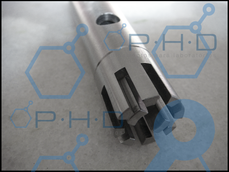 - 1 haste de homogeneização tipo turrax (cabeçote, eixo central e rotor) em inox AISI 304 e bucha deslizante em PTFE, cabeçote com 8 dentes Ø= 19mm e rotor interno com 2 dentes comprimento total de 200mm (ref. ZTDHH19).